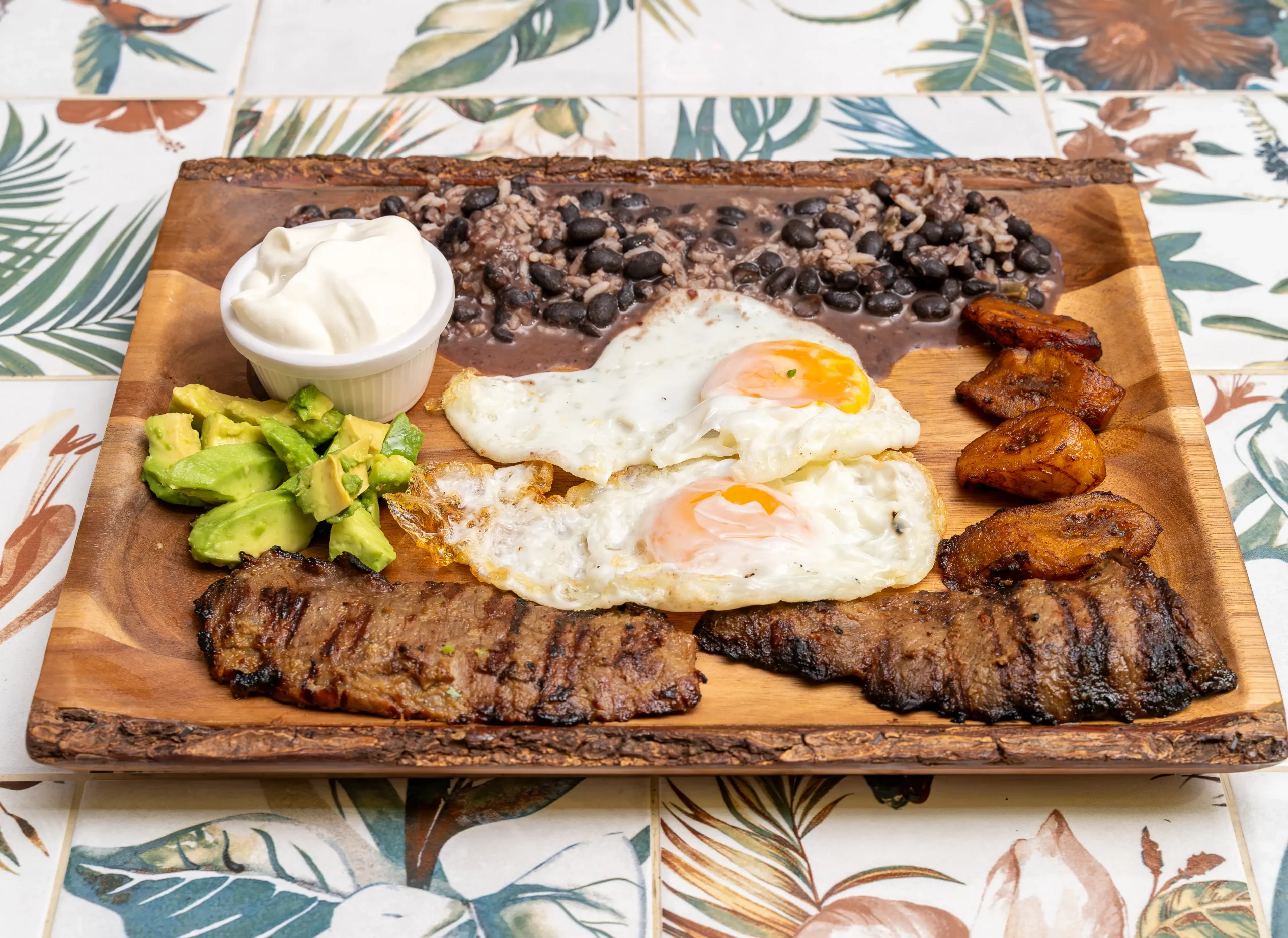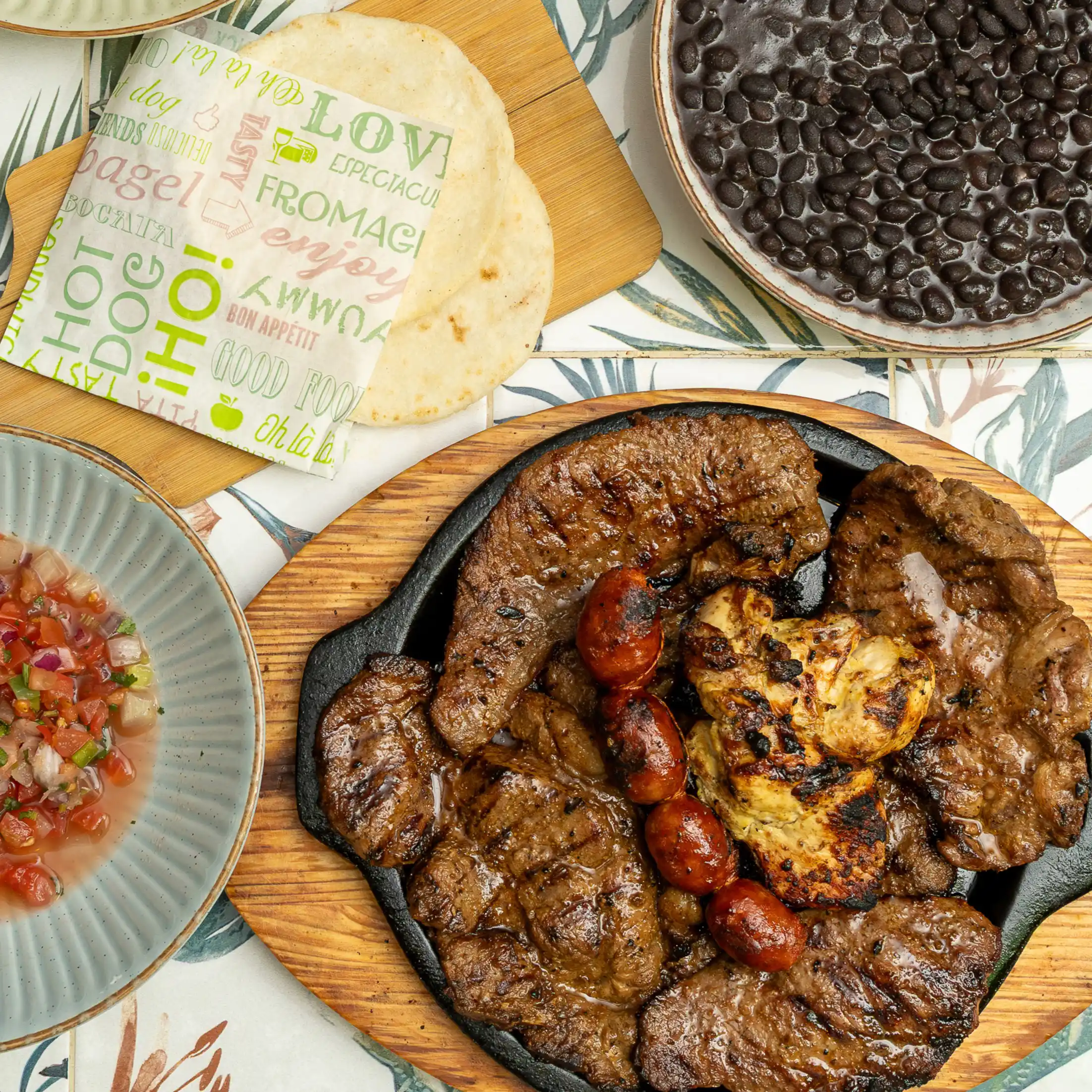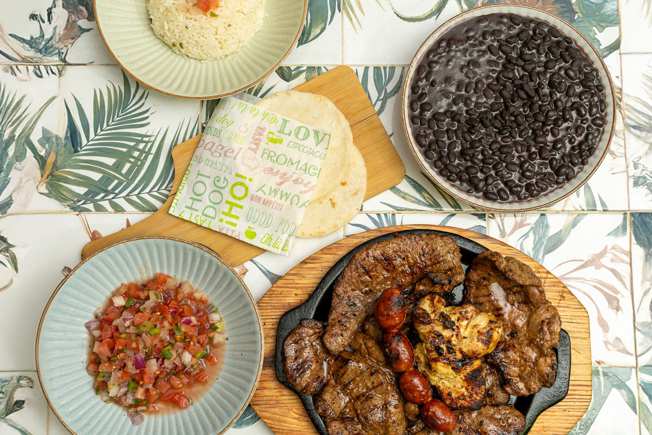 Carne asada, chuleta, pollo, chorizo y churrasco. Acompañado de arroz y frijoles (ilimitados) y pico de gallo.