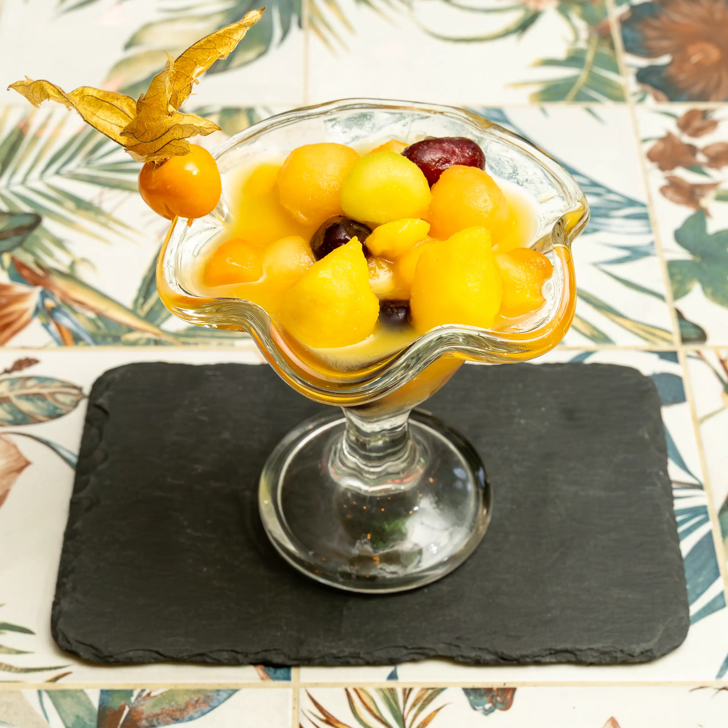 Mango, piña, melón verde y rosa, uva, banana, lima y papaya, mezclado con una botella de Viña Albali de tu elección afrutado o Sauvignon Blanc.