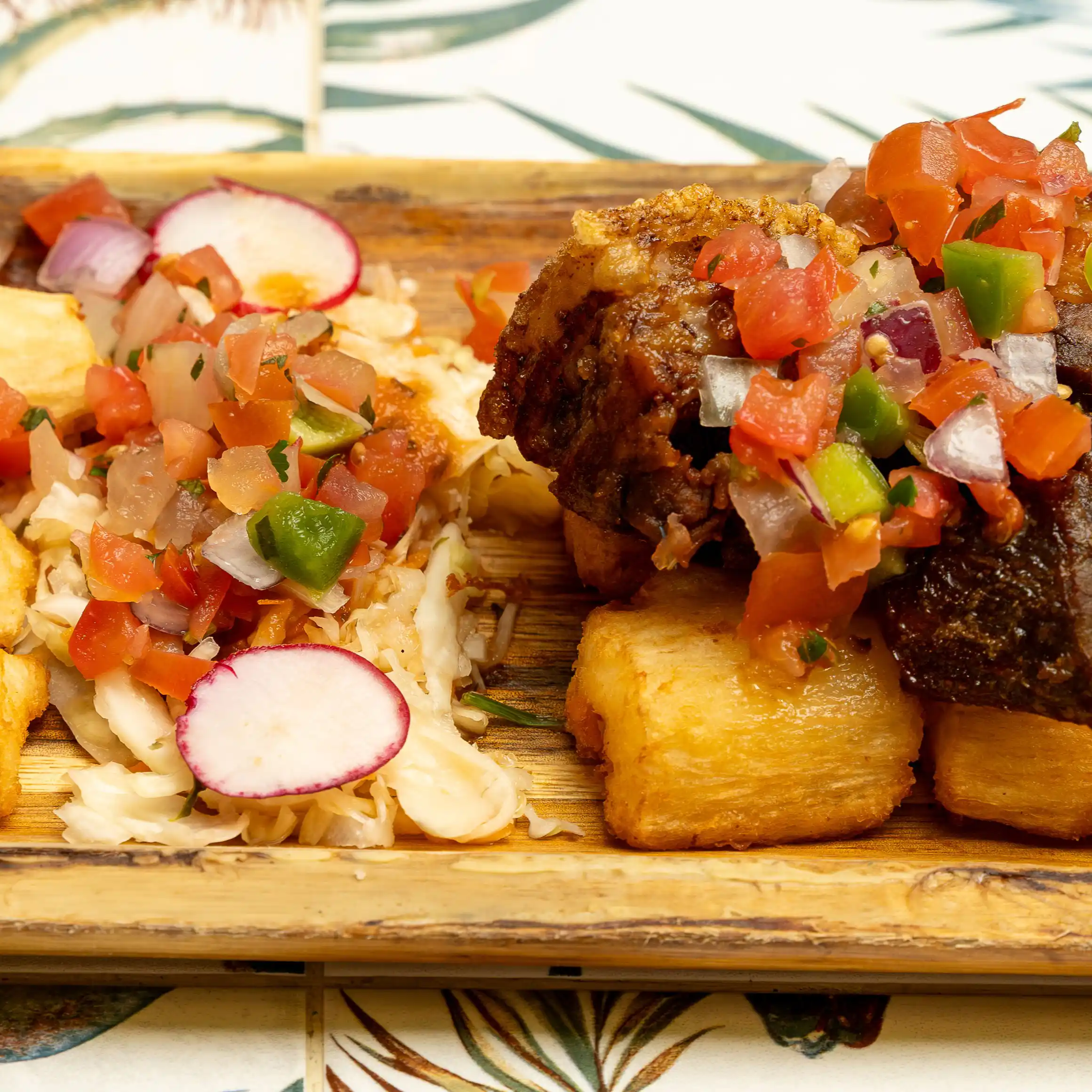 La infaltable yuca frita con chicharrones, excelente opción para comenzar un viaje de sabor a nuestras tierras.