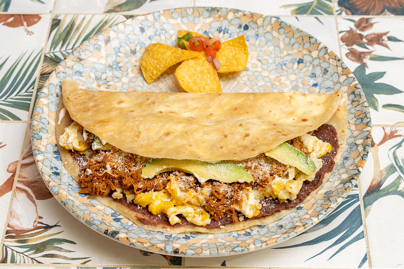Frijoles, crema, huevos revueltos, queso, aguacate y carne mechada.