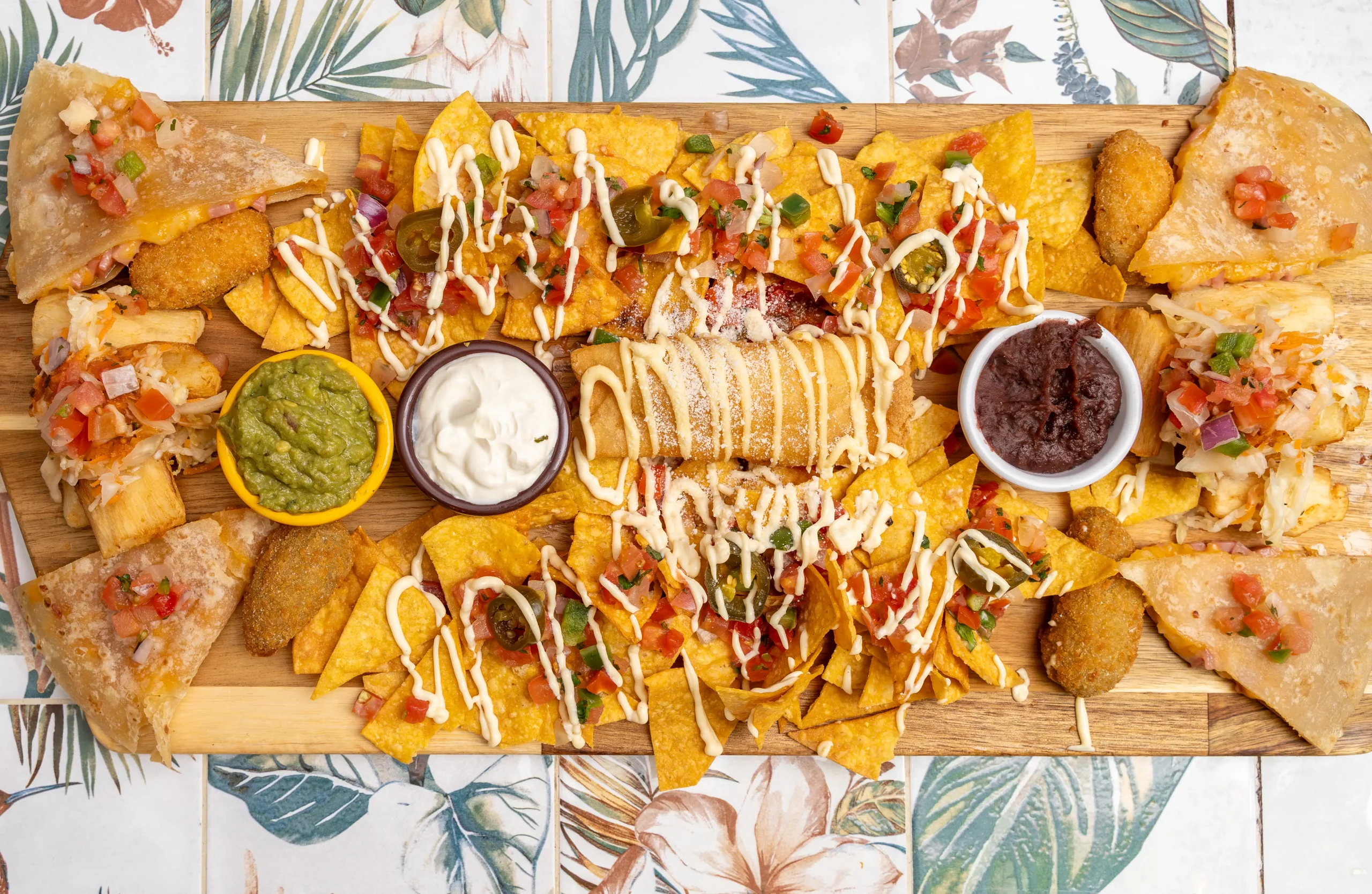 Nachos, yuca, taquito flauta, quesadilla de jamón y jalapeños rellenos.