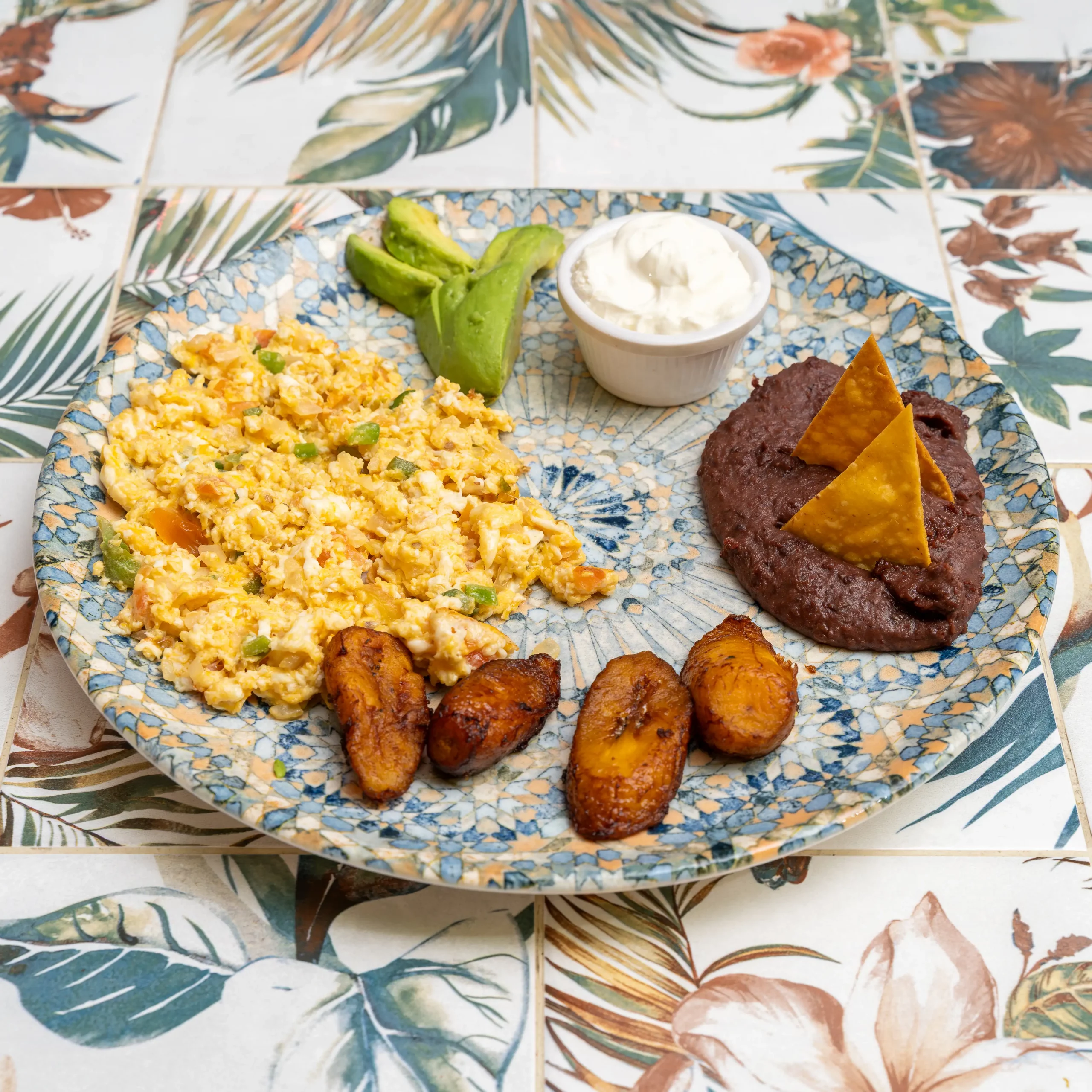 Frijoles, crema, huevos revueltos, aguacate.