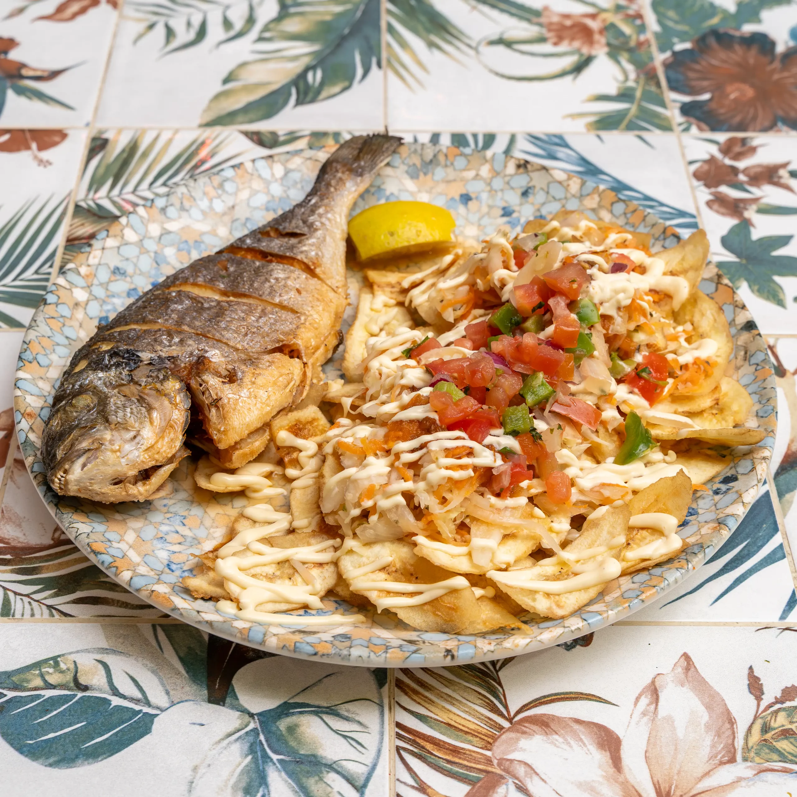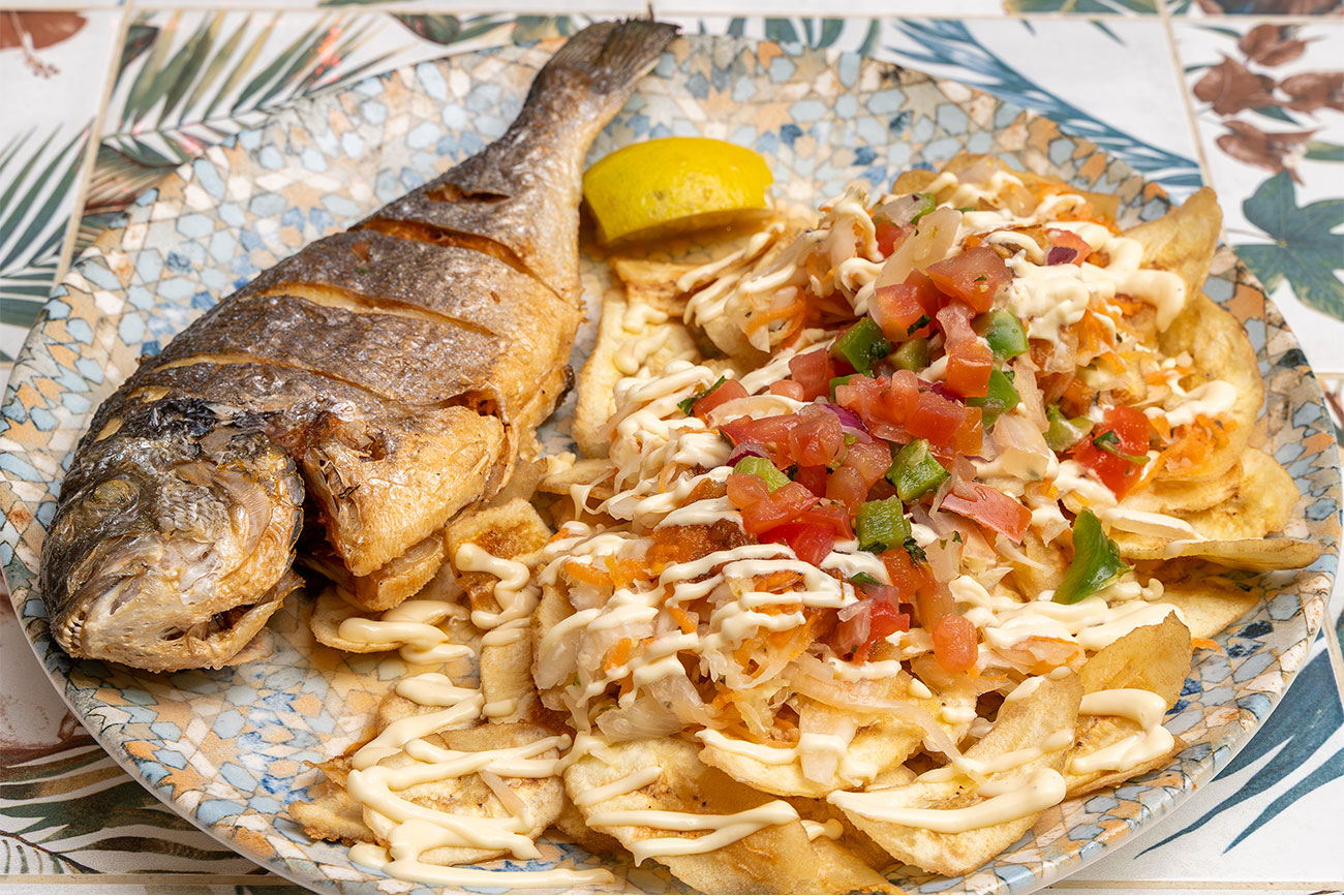 Dorada fresca del día, encebollada al estilo salvadoreño, servida con ensalada, arroz, frijoles, chimol y sin faltar las tortillas.