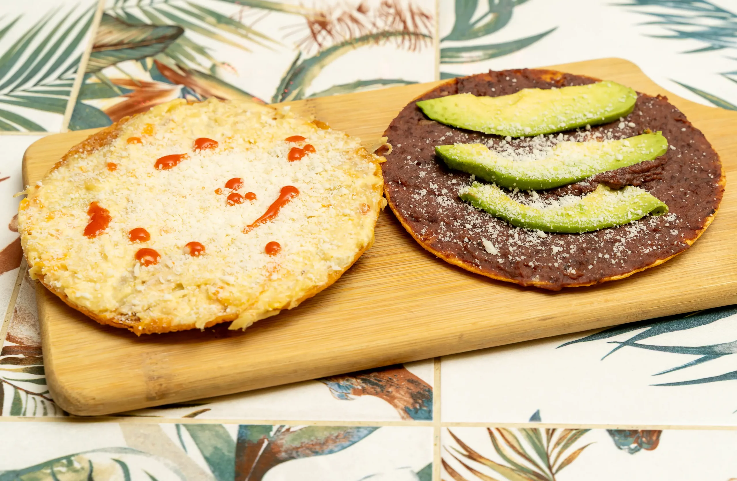 Una tortilla de maíz crujiente cubierta con frijoles refritos, aguacate y queso.