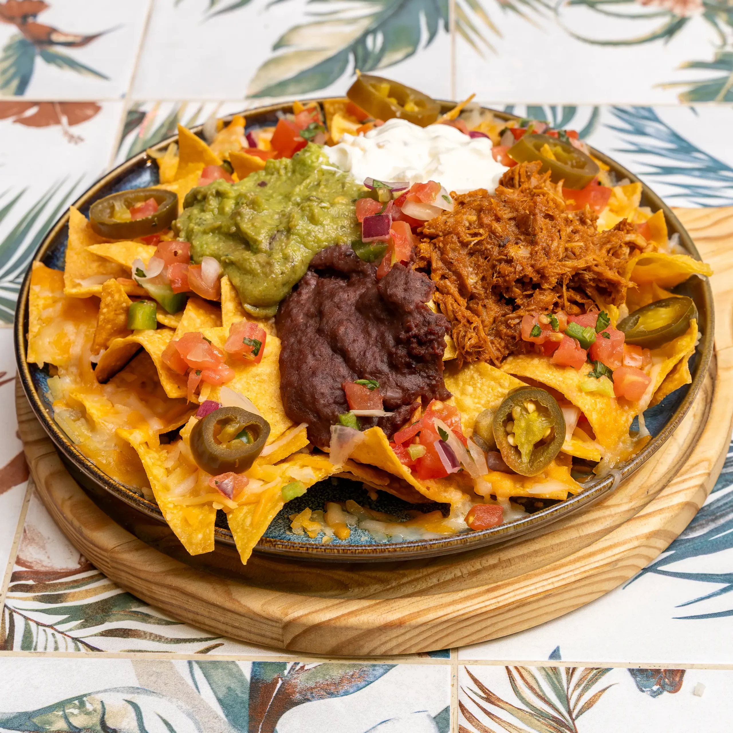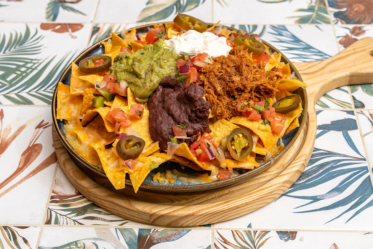 Deliciosos nachos recién hechos, acompañados con guacamole, frijoles refritos, crema agria, cochinita y jalapeños, todo sobre una capa del delicioso Monterrey Jack Cheese gratinado.