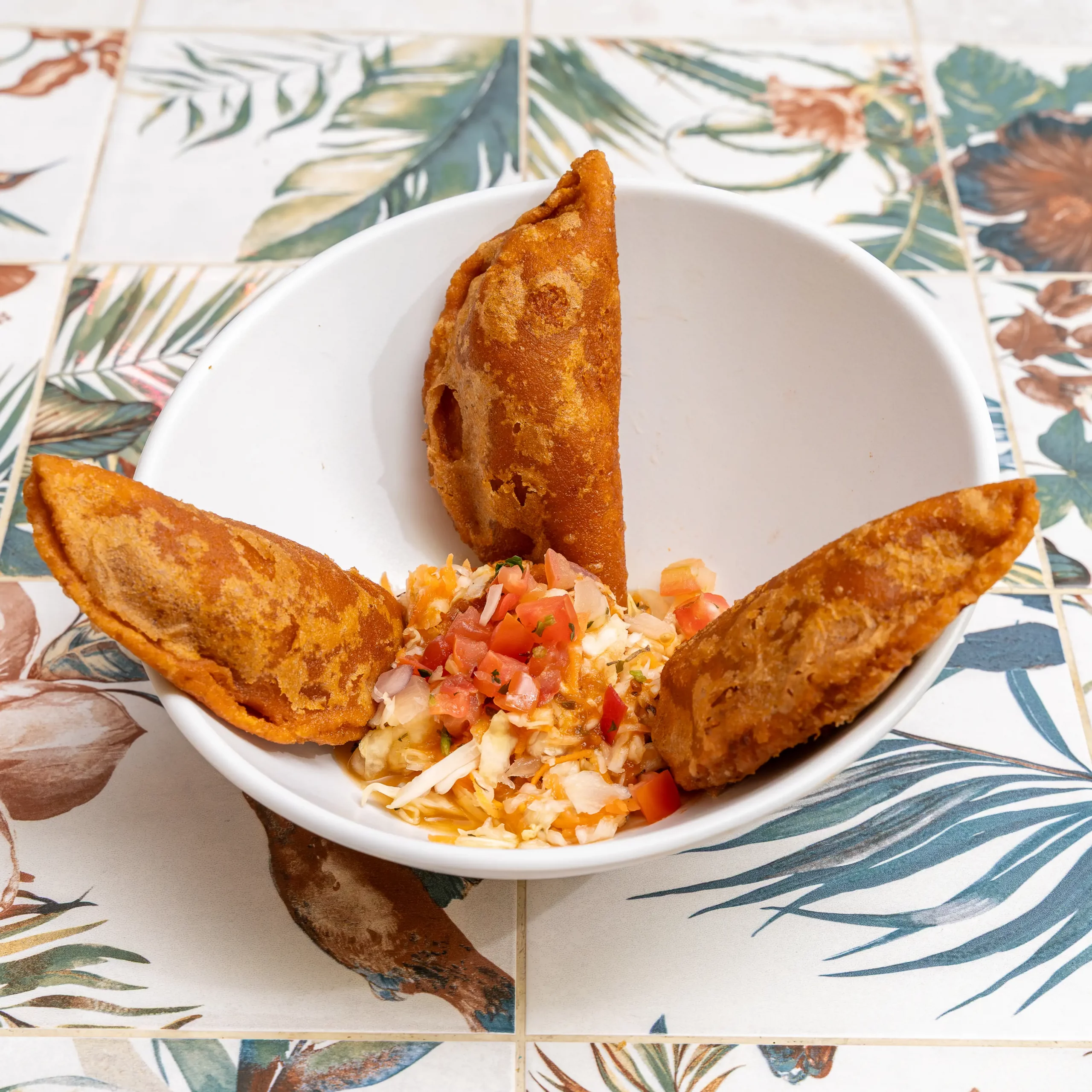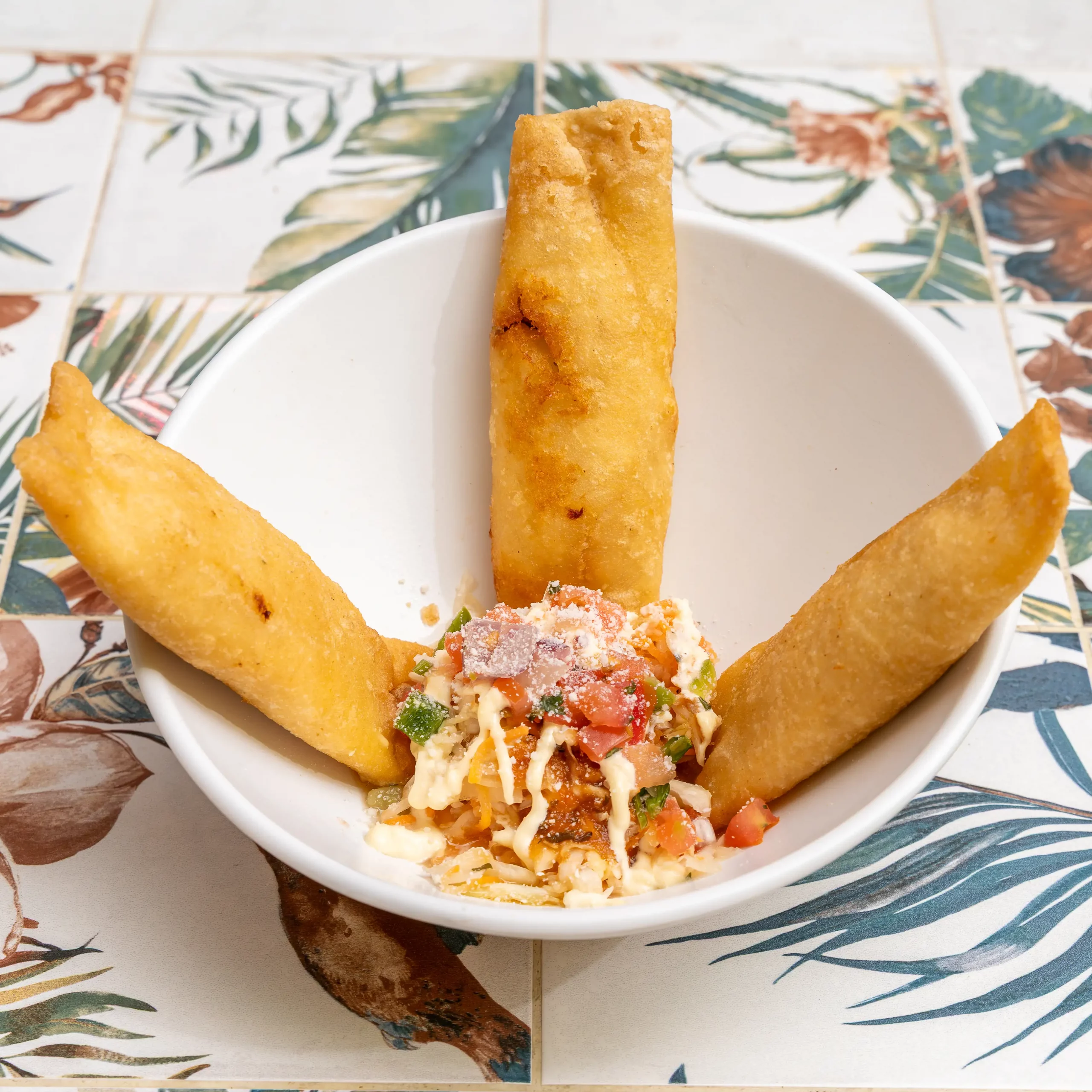 Crujientes tacos rellenos de pollo con encurtido, tomate, queso en polvo.