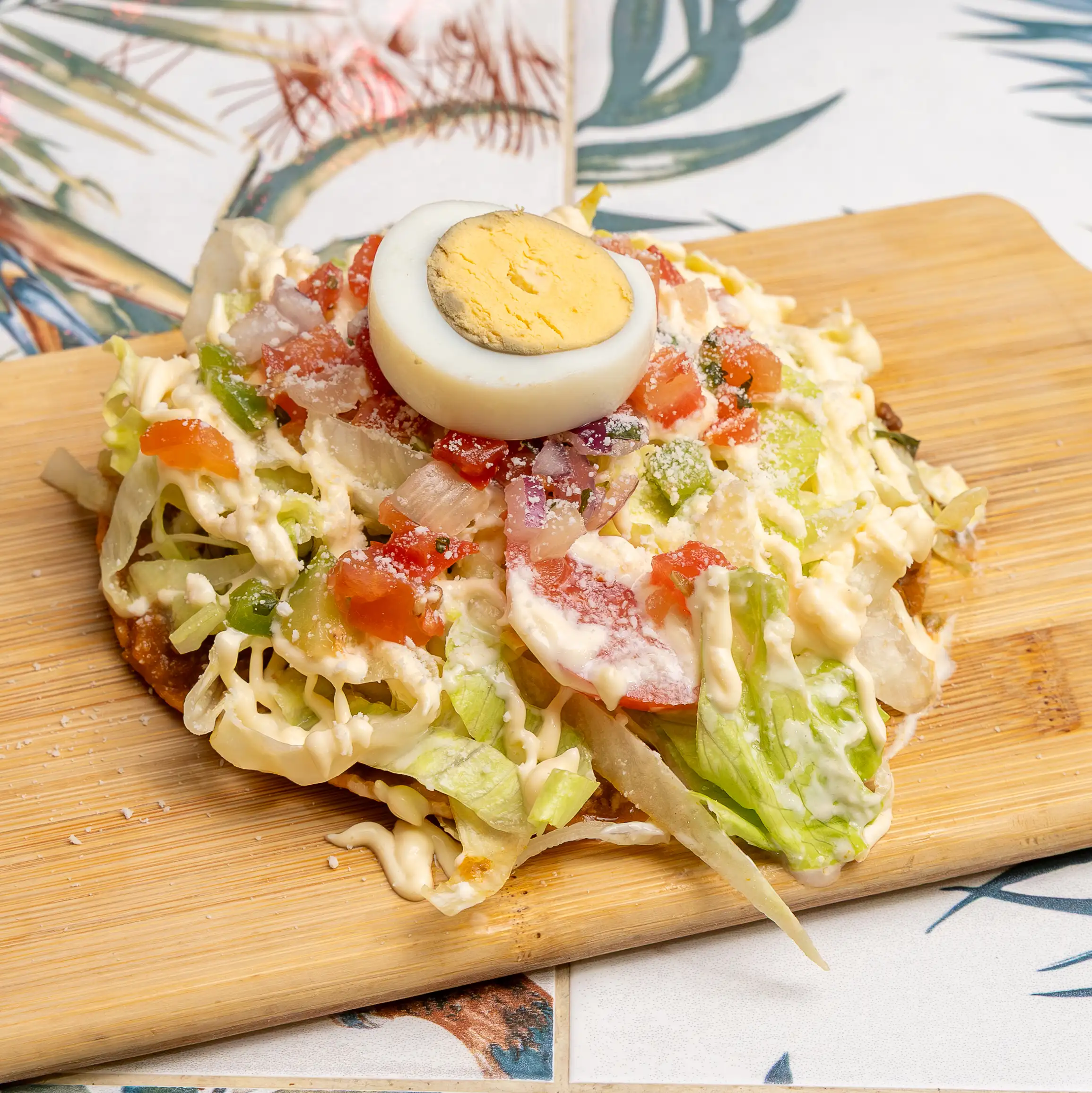 Tortilla crujiente con carnita picada, lechuga, tomate, huevo, queso en polvo y aderezo de la casa.