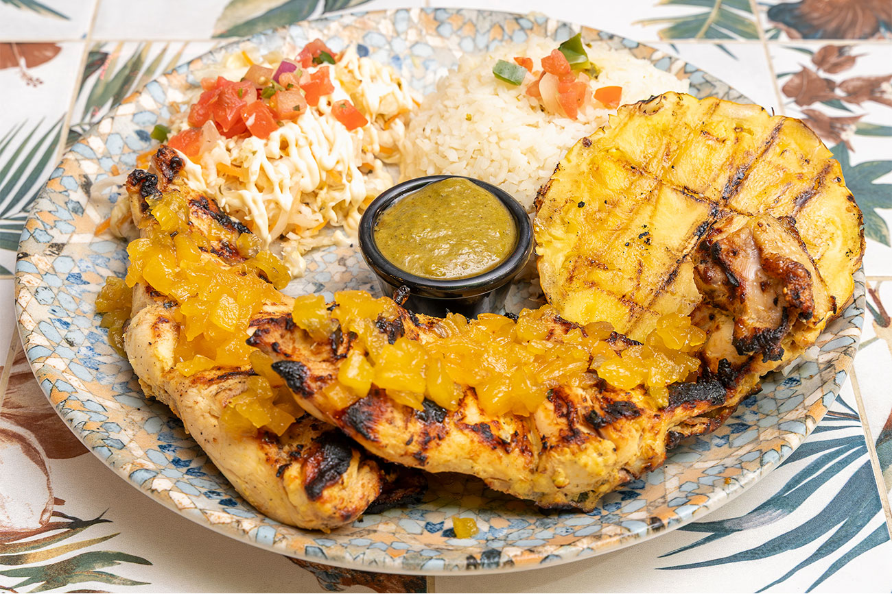 Deléitate con esta deliciosa receta de la mamá: pechuga de pollo a la parrilla coronada con una exquisita salsa de piña caramelizada con sésamo. Servida con arroz y ensalada. Un recuerdo inolvidable.